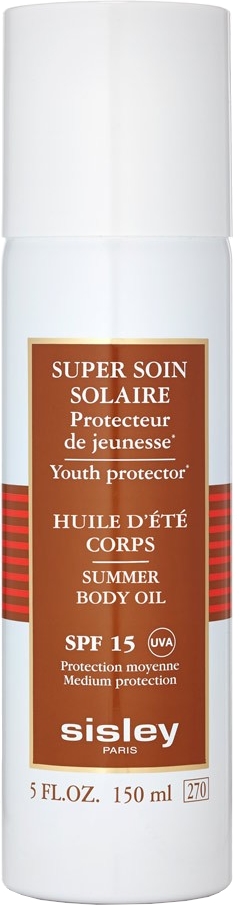 Super Soin Solaire Huile Soyeuse Corps SPF 15 (protection moyenne) aide votre peau à préserver son capital solaire. L’Huile Soyeuse SPF 15 de Sisley protège votre peau contre les effets du photo-vieillissement (vieillissement accéléré lié au Soleil) grâce à une combinaison de filtres solaires UVA et UVB dernière génération et d’actifs soins ultra-performants.